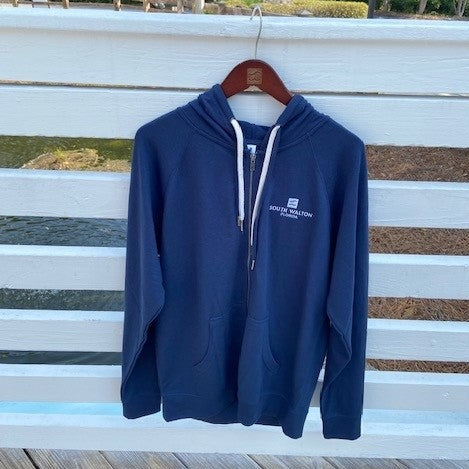 Navy hoodie has white embroidered South Walton Florida logo